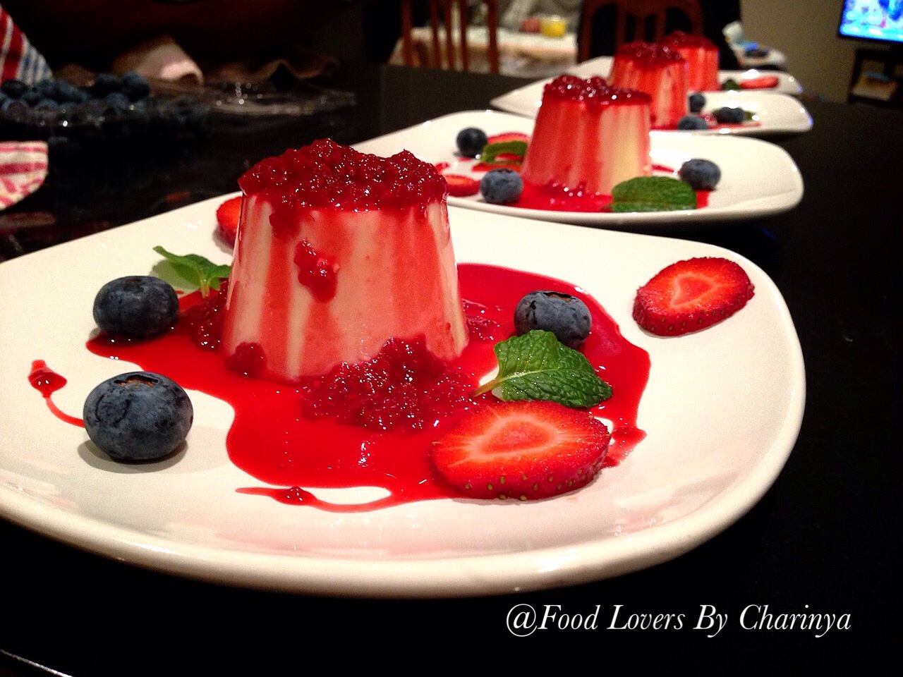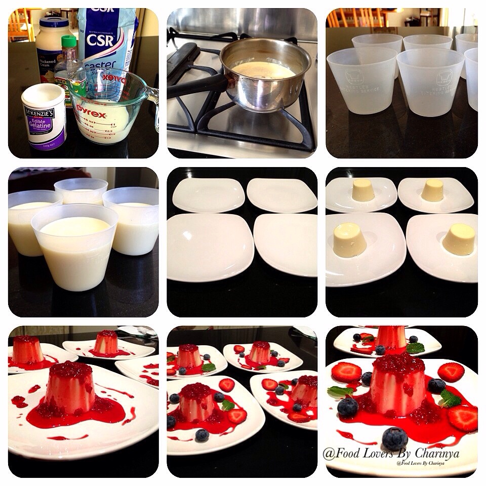 3. To serve, break the seal by inserting a small knife between the panna cotta and the mould. Hold the dessert above a serving plate and shake to release. Serve the dish with your choice of fruit sauce (I prefer raspberry sauce) then top with fresh berries and mint leaves.