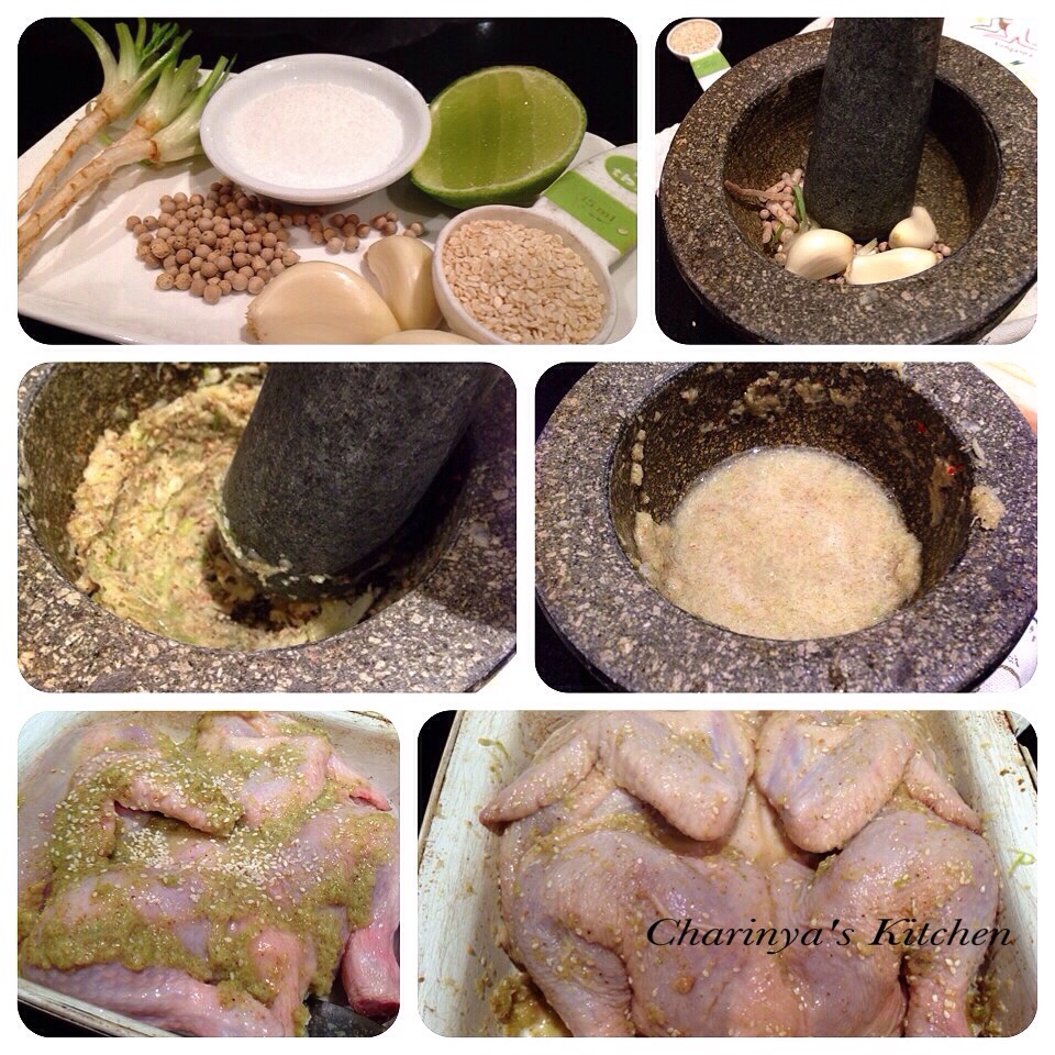 Grind garlic, coriander root and pepper, then add salt, sugar, water and lime juice.