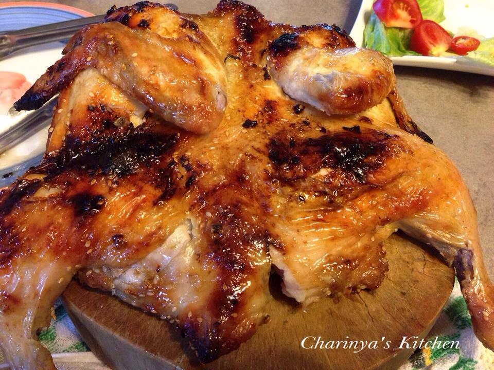 Grilled chicken Thai style, or as we call it in Thai language, Kai Yang ไก่ย่าง. This dish you will see both as street food as well as in good restaurants. It is often paired with papaya salad (som tum) and sticky rice (khaw-niow). It is also eaten with raw vegetables, and often dipped in spicy sauces. I got this recipe from the Kruaklaibann website (www.kruaklaibaan.com). This website is where all the Thai people who live overseas share their cooking. The recipe comes from Khao Suan Kwang (ไก่ย่างเขาสวนกวาง) a district in Northeastern Thailand where they have a really good reputation for doing grilled chicken.