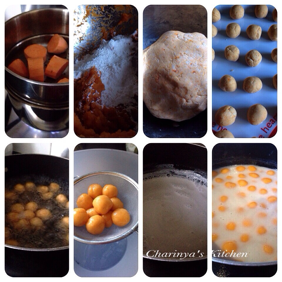 This Thai dessert has a sweet and creamy taste. It is very easy to make. I even remember making it when I was at school. Originally it featured taro root instead of sweet potato, but now there are many varieties. Instead of using sweet potato you can use carrot or beetroot, which will give you a different colour.