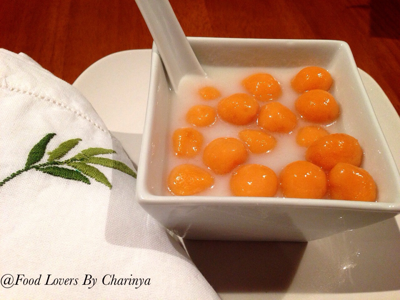 Kanom Bau Loyขนมบัวลอยมันเทศ Glutenous rice flour dumpling with sweet potato in sweet coconut cream.