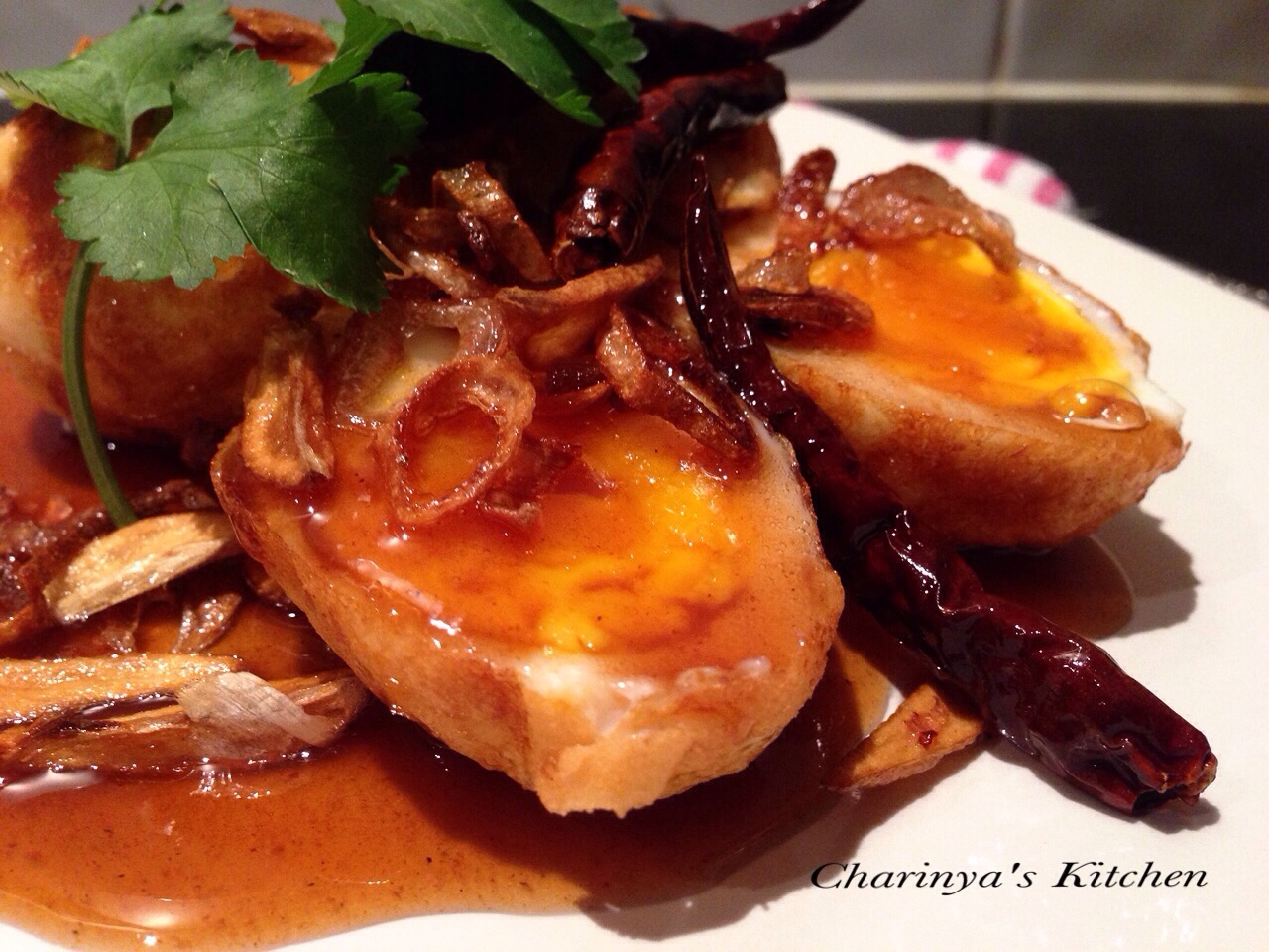 Arrange the eggs on a plate. Cover with the sauce then top with the fried shallots, fried garlic, fried chilies and fresh coriander.