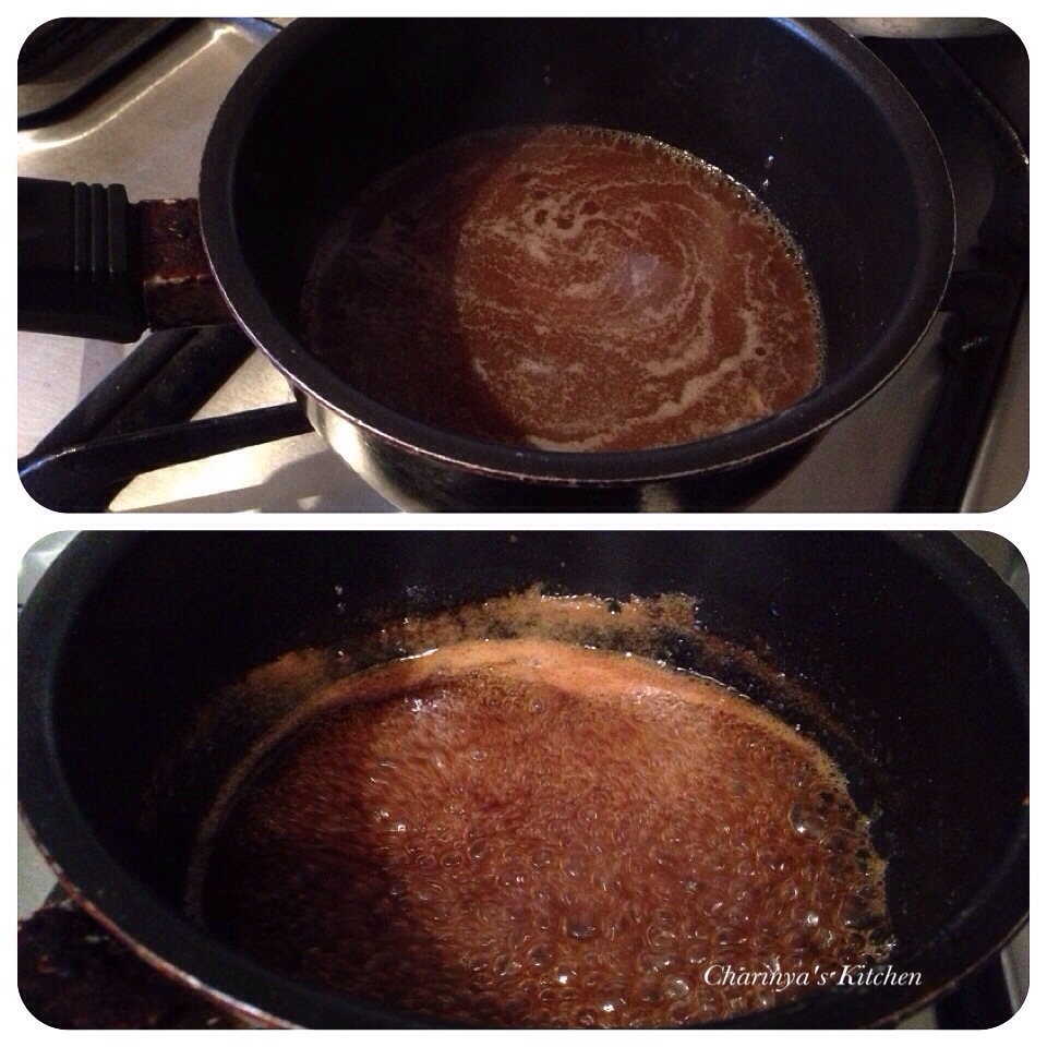>> Make the sauce by combining tamarind purée, water, fish sauce and palm sugar in a small sauce pan. Cook over medium heat until syrupy, and add more water or any of the other ingredients to get the 3 flavours of sweet, salty and sour in balance. Remove from heat. When the sauce is cooled, the taste will be more pronounced. The sauce will get thicker as it cools down as well.
