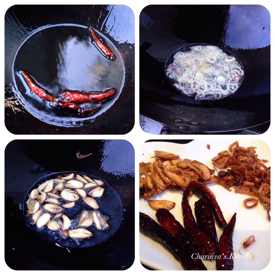 >> Add vegetable oil in the wok and set to low heat. Fry the dry chilli until brown on each side and set aside. Then fry garlic and onion by stirring constantly until lightly browned. Set aside.