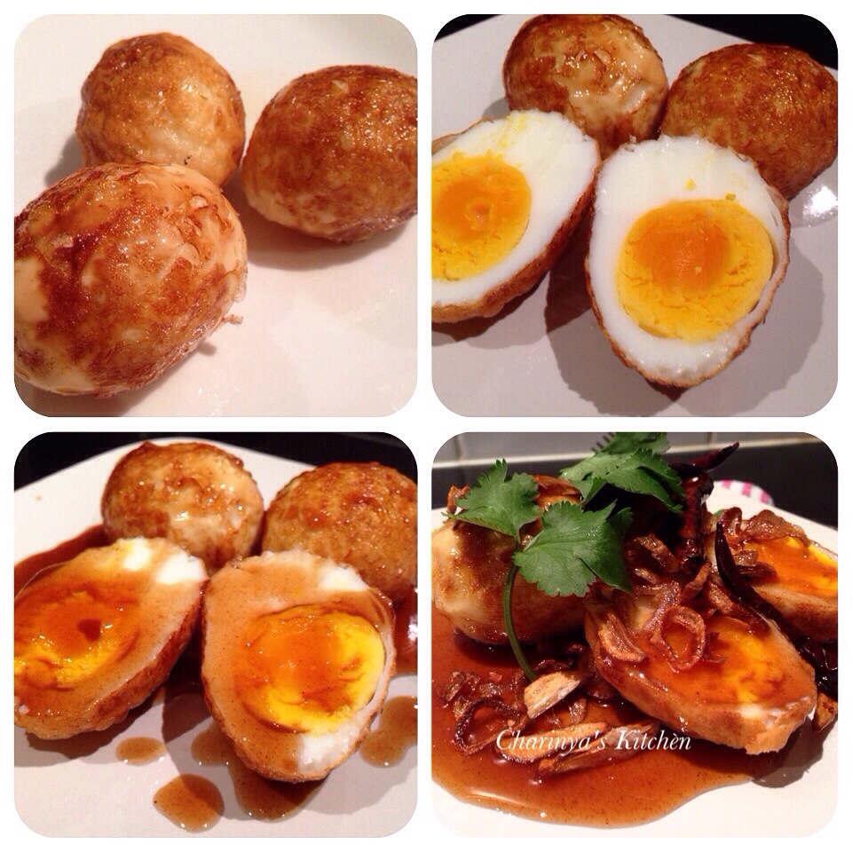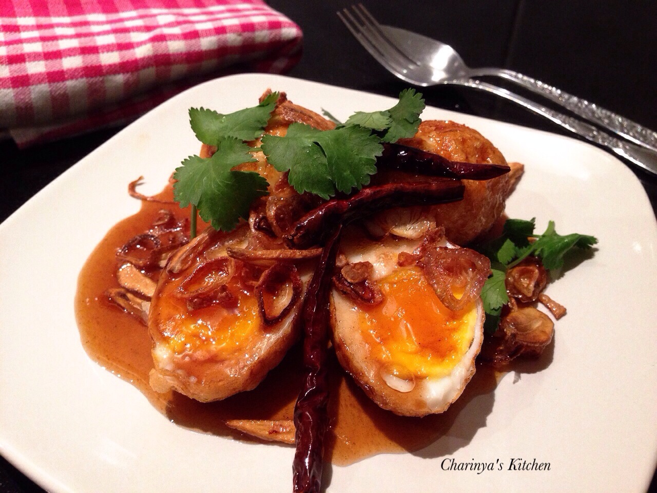Son-In-Law Eggs (deep-fried boiled eggs, topped with a sour & sweet tamarind sauce) ไข่ลูกเขย This dish has a curious name, and there is probably a story behind it. In the version I heard, a mother-in-law cooked a dish with bitter vegetable dip with sweet & sour tamarind sauce, but the son-in-law didn’t like the taste of the bitter vegetable. Being a good mother-in-law she had to create another dish for him, which was deep fried boiled egg topped with the leftover sauce. After that inventive creation other people in the family tasted it and were impressed, leading to the dish becoming popular around the country:-) would you like to try it? You will need…