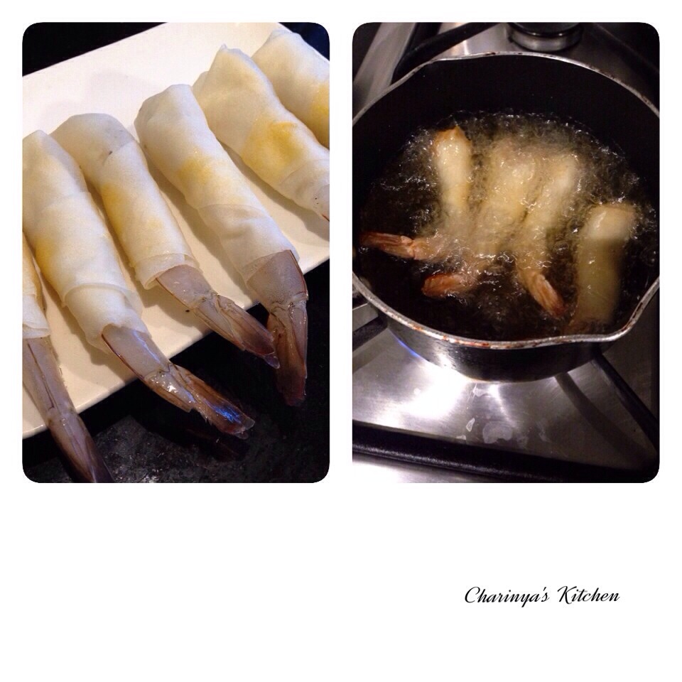 - Heat up a small saucepan with oil and deep fry the prawn spring rolls until golden brown and crispy. Serve while hot, with sweet chilli sauce available.