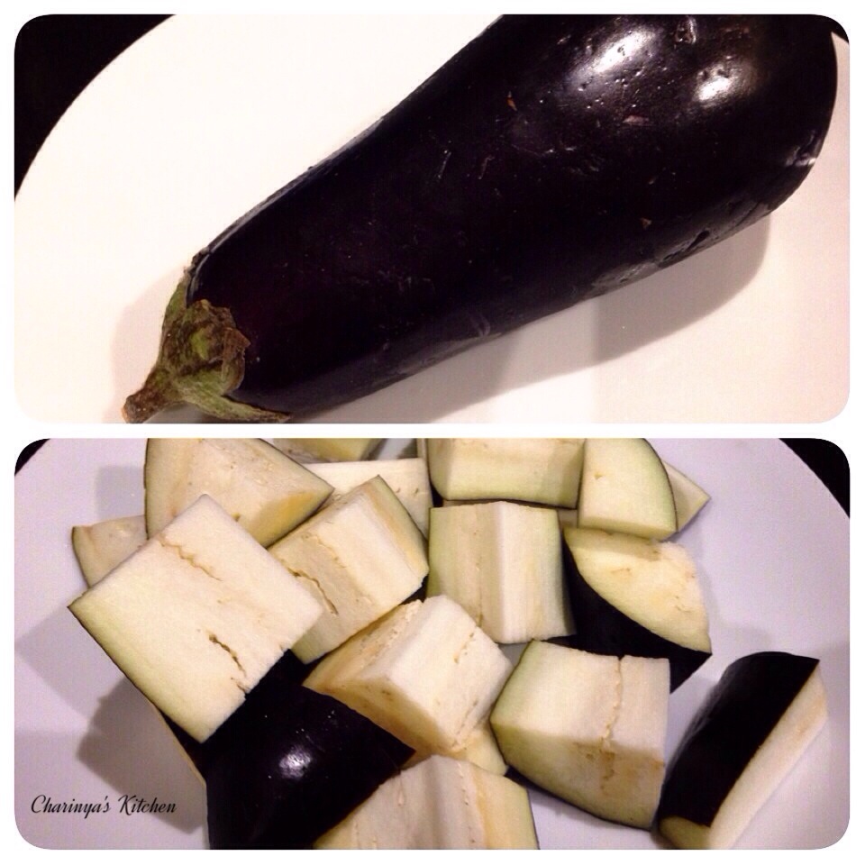 3. Cut the eggplant lengthwise into quarters, then chop across the quarters to make big chunks ~3 cm.