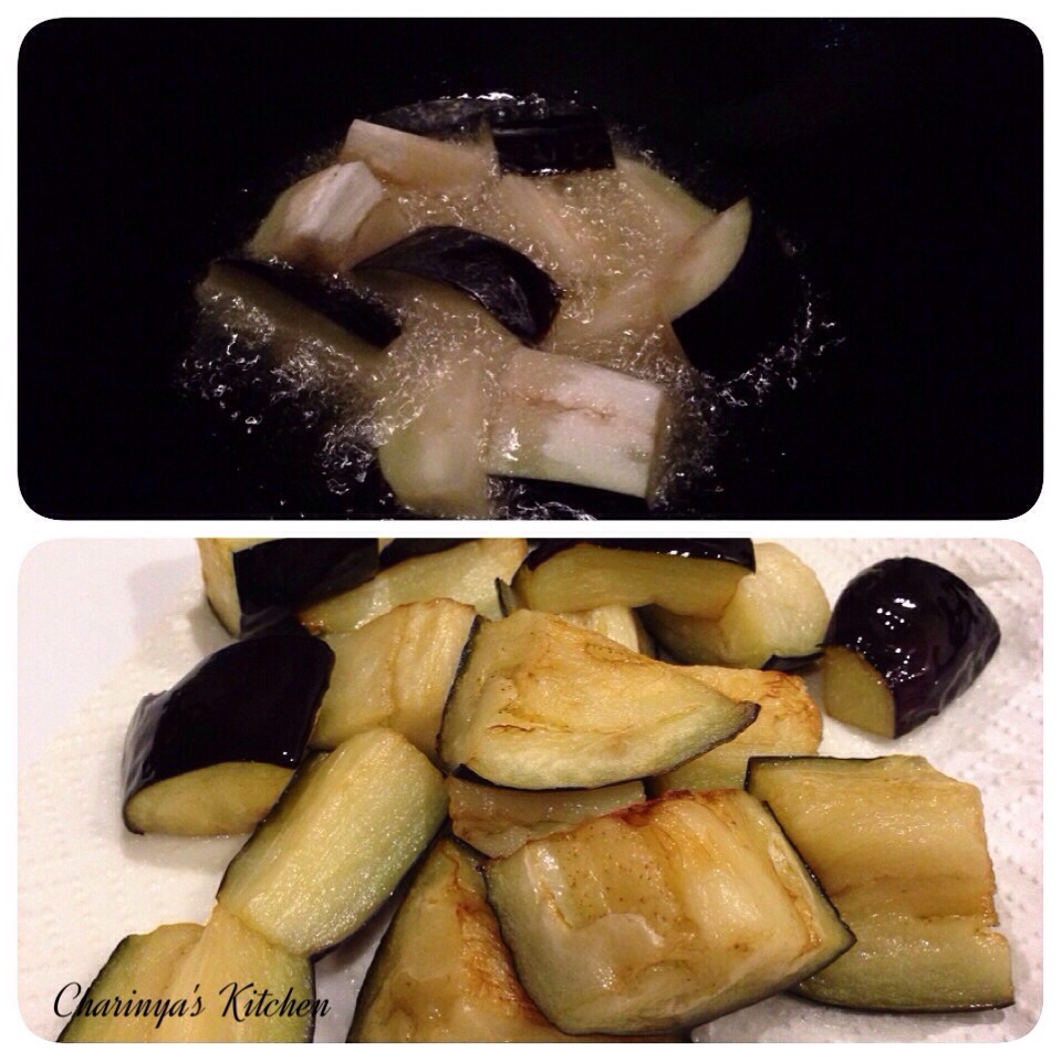 4. Heat the work with oil and fry the eggplant in 2 batches in the hot oil for 2-3 mins until soft. Set aside.