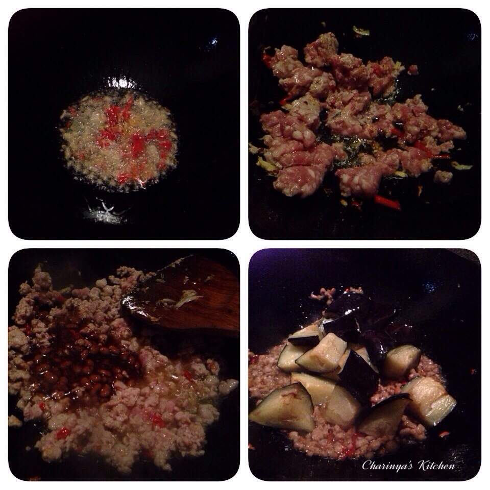 9. Add fried eggplant to the wok and gently mix with the sauce and pork.