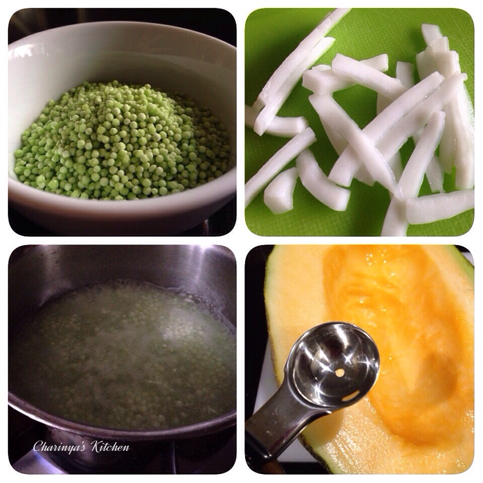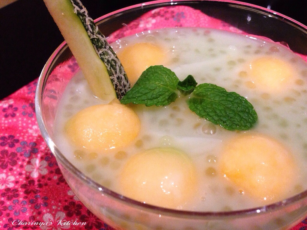 6. To serve add rockmelon. You can use the spoon to scoop the rockmelon into a ball shape or dice the rockmelon.
