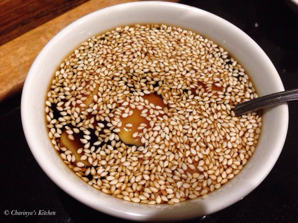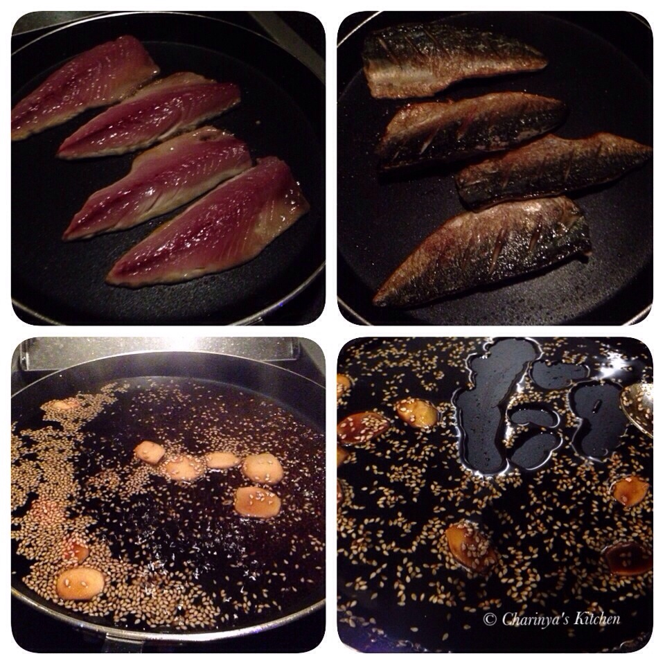 1. In a small bowl mix soy sauce, mirin, brown sugar, sliced ginger, roasted sesame and water then set aside.