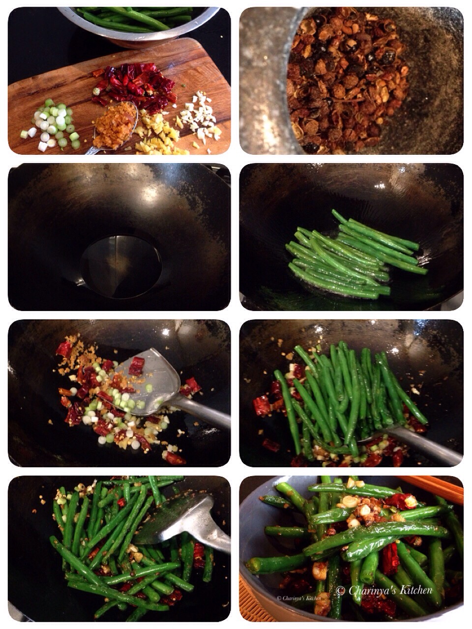 Stir fried green beans with dried chilli and Sichuan peppercorns. #recipe Ingredients** ~200g Green beans trimmed at both ends 1 tbsp Sichuan peppercorns, crushed 1 tsp chopped garlic 1 tsp chopped ginger 1 tbsp chopped pickle radish 1 tbsp chopped spring onion (white part only) •Dried chilli as desired cut in 1 cm lengths • Oil to fry** ** #Seasoning 1 tsp seasoning powder (stock powder) 1/2 tsp of salt 1 tbsp Chinese cooking wine #Method • Heat the oil in a wok at medium hot. • Fry the beans in 2 batches until the beans soften. Remove from the wok. • Remove most oil from the wok leaving just 1 tbsp. • Add Sichuan peppercorns, garlic, ginger, onion, pickled radish and dried chilli to the wok. Fry until fragrant • Return the beans to the wok along with salt, seasoning powder and Chinese cooking wine. Mix well and turn the heat off. #thai ถั่วผัดพริกเกลือแบบเสฉวน สูตรจากบล็อกครัวเนินน้ำ ขอบคุณเจ้าของสูตรค่ะ **วัตถุดิบ** • ถั่ว ของพี่เค้าใช้ถั่วฝักยาว แต่ครัวจริญญาใช้ถั่วแขก เพราะหาได้ง่าย ตัดหัวท้ายพอไม่หั่นชิ้นเล็ก ใครจะหั่นก็ได้นะคะ • พริกหอม ชวงเจียใช้ Sichuan peppercorns ค่ะ ที่ออสมีขายตามซุปเปอร์ทั่วไปและร้านเอเชีย อันเดียวกับที่ใส่กุ้งอบวุ้นเส้น • กระเทียมสับสักช้อนชา • ขิงสับ 1 ชช • หัวไชโป๊สับสักหนึ่งช้อนค่ะ • พริกแห้งหั่นท่อนสั้นๆ • ต้นหอมซอยเอาเฉพาะส่วนต้น • น้ำมันสำหรับผัด **เครื่องปรุง** • เกลือสักครึ่งช้อนชา • ผงปรุงรสคนอร์/รสดี สัก 1 ชช • เหล้าจีน ใส่ไปช้อนหนึ่ง **วิธีทำ** ตั้งกะทะใส่น้ำมันให้ร้อนไฟปานกลาง เอาถั่วลงผัด ทำทีละครึ่งก็ได้ค่ะจะได้ทั่วๆผัดพอยุบๆก็ตักใส่จานพักไว้ เหลือน้ำมันในกะทะนิดหน่อยเอา พริกเสฉวน กระเทียม ขิง พริกแห้ง ไชโป๊และต้นหอม ลงผัดให้หอม ใส่ถั่วกลับไป เติมเกลือ ผงปรุงรส เหล้าจีน ผัดให้ทั่ว ตักใส่จานเสริฟค่ะ