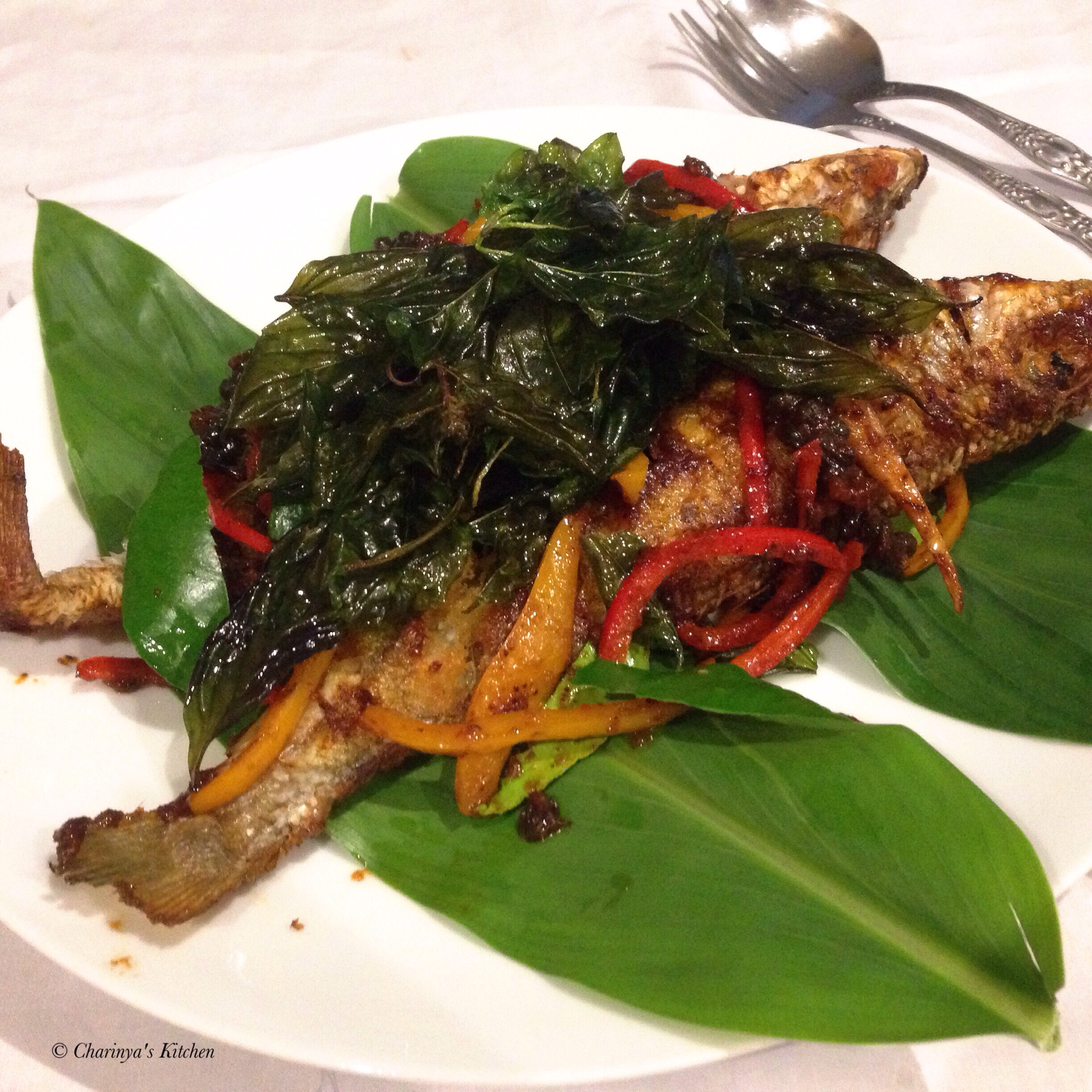 7. Serve the fish on a plate and top with crispy basil.