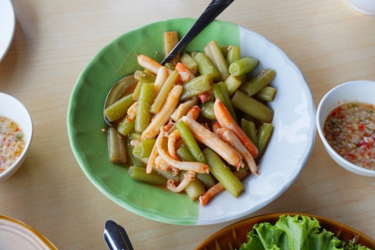 Next dish was my choice, Pad sai bau, stir fried lotus stems (ผัดสายบัว) The dish reminds me of my childhood, where my mother and I rode on a boat to pick the lotus stem from the river near our village. This lotus stir fried was special as the restaurant also added claws prawns (ก้ามกุ้ง) as well and it didn’t disappoint. I think I had more of this dish than anyone.