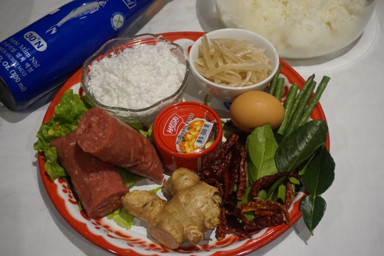 Crispy rice salad with fermented pork is known as Nam clook or Khao tod nam clook in Thai. Also known as Nam khao in Lao, the dish features deep fried red curry rice balls mixed with basic Thai seasoning ingredients. These ingredients include fish sauce, lime juice, chilli, fried peanuts, sliced ginger, chopped coriander, spring onion and pork skin. Of course there is always the most special ingredient, fermented pork.