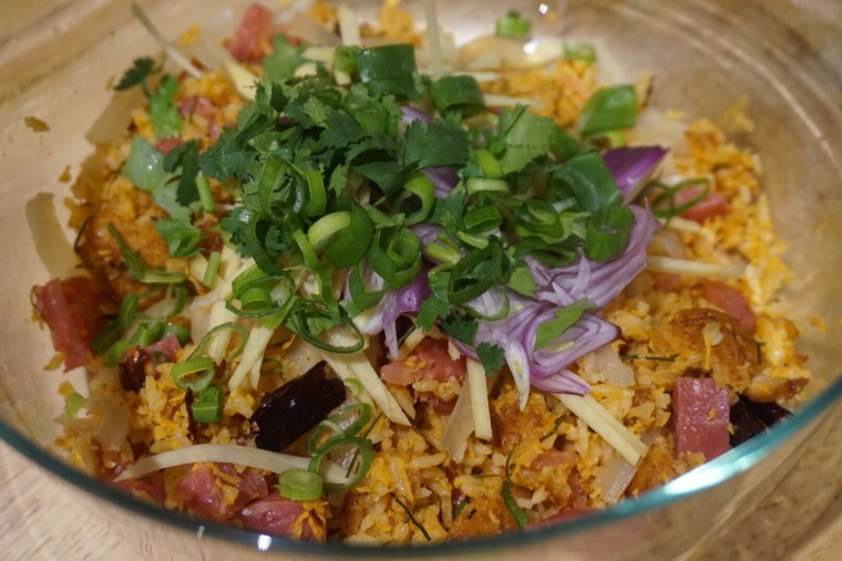 3. Add spring onions, coriander, ginger, shallots fried peanuts and fried dried chilli.