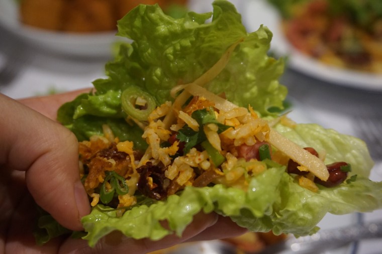 Serve in lettuce cups or on betel leaves and with peanuts and deep fried chilies.