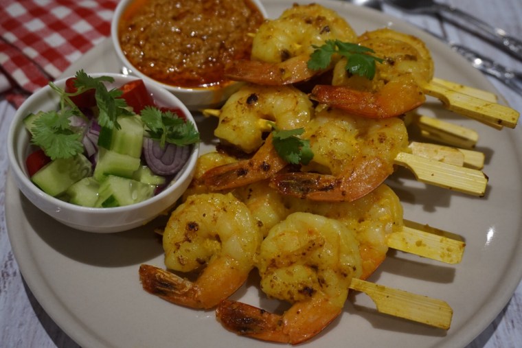 Homemade satay prawns served with peanuts dipping sauce and Ar-jard (cucumber, onion and red chilli in vinegar)