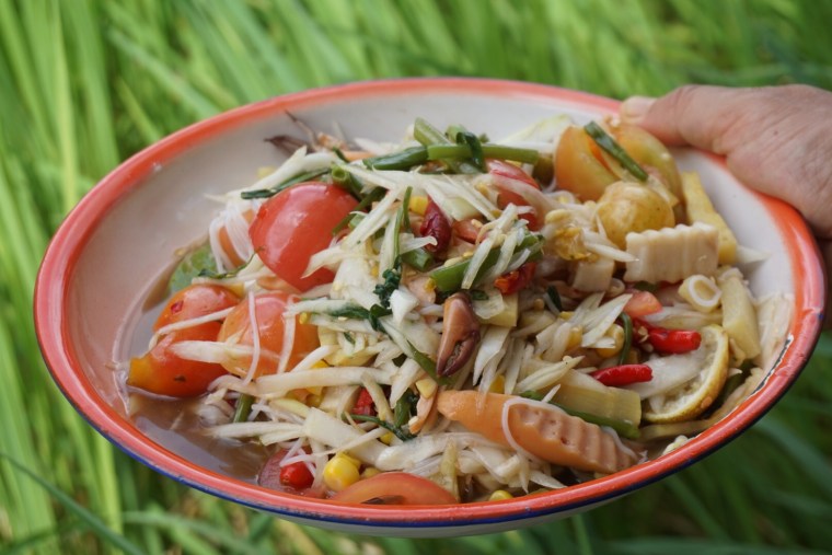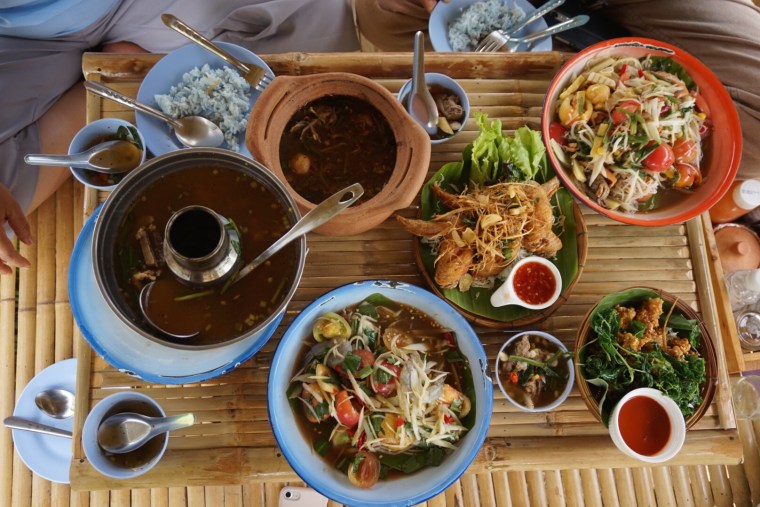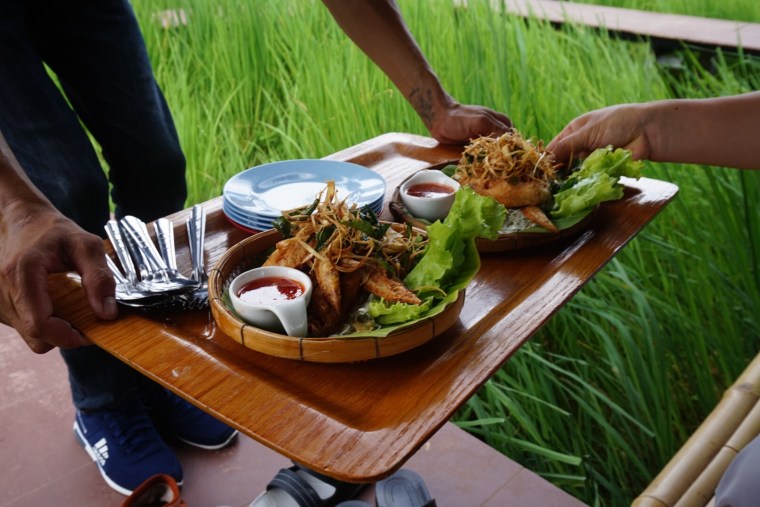 As a foodie I can’t finish the blog without talking about food. Let’s check out the restaurant in Kaset Sombun named “Bann nok café”, which is the story I want to share with you. The restaurant is set in the middle of green rice paddies and has small, private huts for their guests to enjoy their dining. The food is also amazing. We ordered papaya salad, papaya salad with raw prawns, fried crispy chicken, beef soup in clay pot, and more. All the food came out quickly and was beautifully presented. The price are reasonable as there were about 12 of us and cost about 1,200 Thai baht (AUD 58)