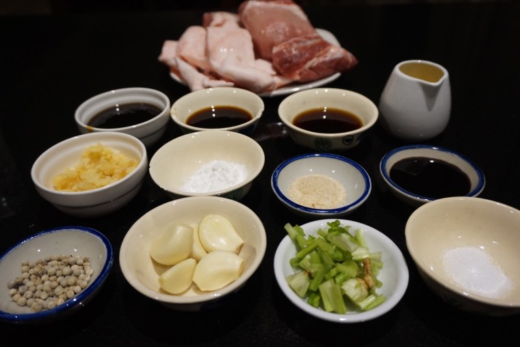 - Put pork and the marinade paste from step 2 into a large bowl, and add all the sauce then mix well. Cover and marinate in the refrigerator overnight.