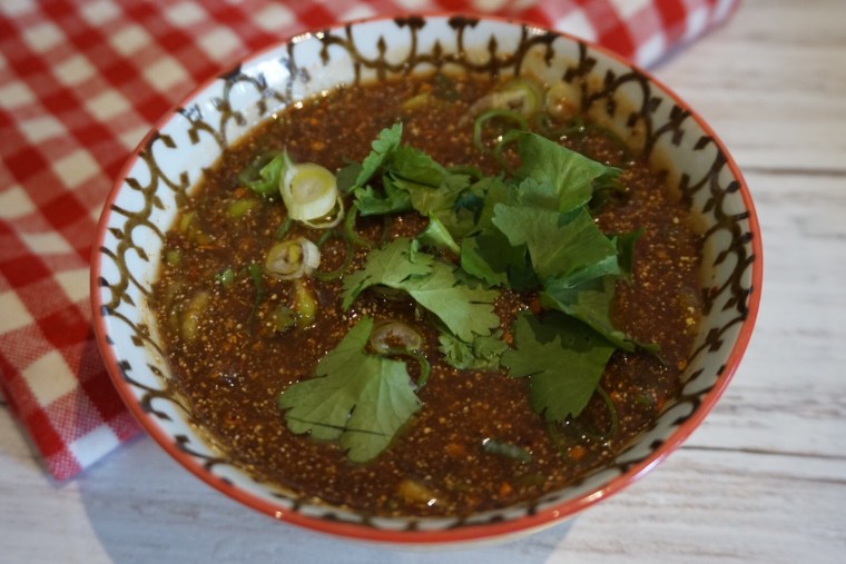 Boil tamarind, water, sugar and fish sauce until syrupy. Leave the mix to cool then add chilli powder, ground roasted rice, chopped spring onion, chopped coriander and, ideally if you can find it, chopped sawtooth coriander.