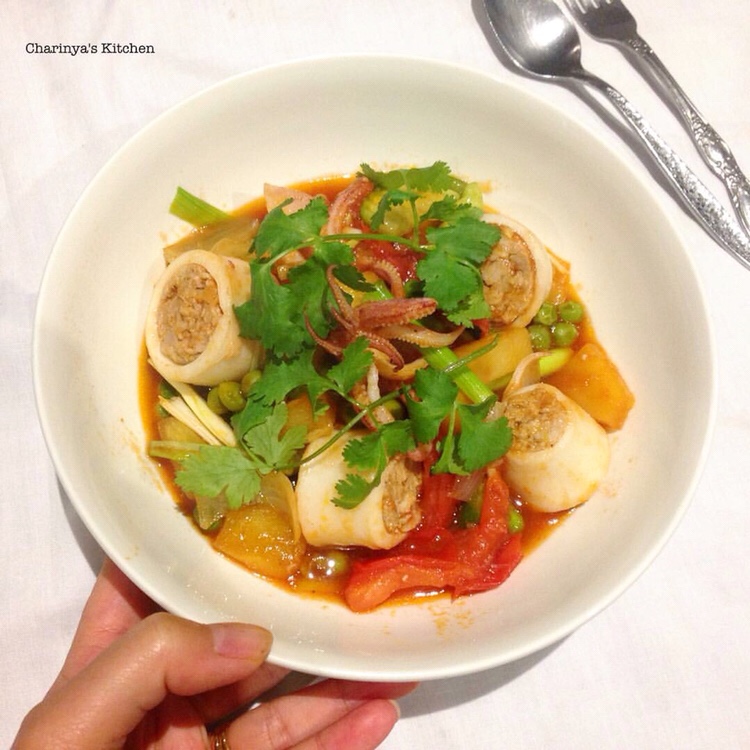 Sweet and sour sauce creates a rare Thai dish that features no chilli and results in a plain taste. This makes it perfect for anyone seeking a break from fiery flavours. This dish highlights squid stuffed with pork mince and sweet & sour sauce, which may take a bit of work but I can confirm it is worth making.