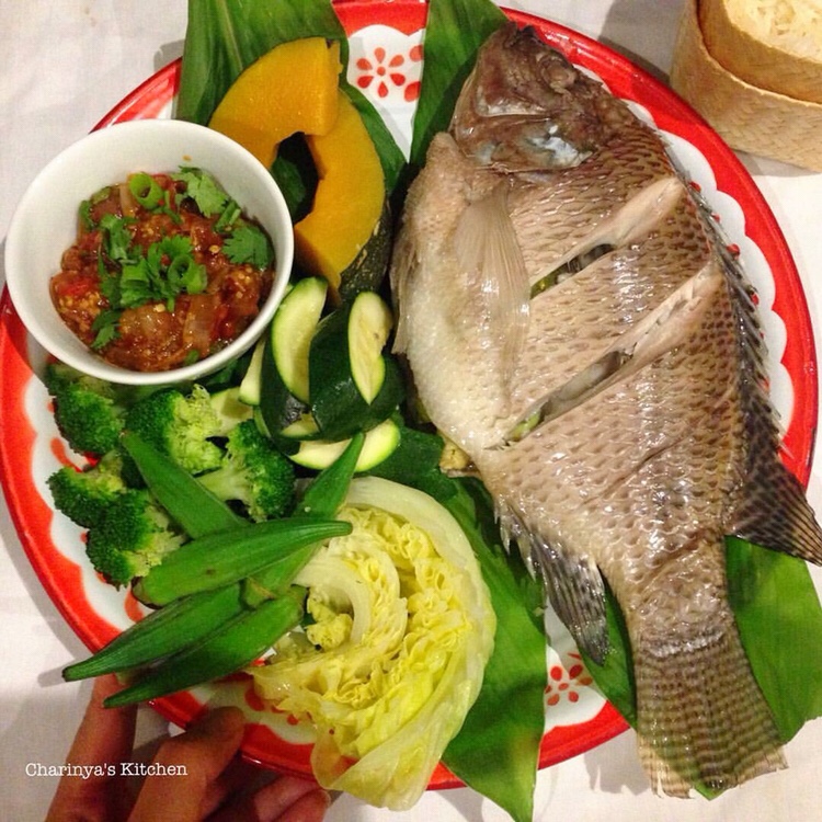 Steamed tilapia with vegetables and chilli & tomato relish is among my favourite fish dishes. The greater the variety of accompanying vegetables you can find the better. This dish is particularly good with sticky rice.